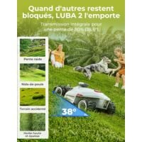 - Un choix de confiance pour les complexes et les terrains: grâce à une couverture améliorée du signal RTK et à la technologie de positionnement par vision 3D, les endroits avec des signaux faibles ou une couverture d’arbres importants ne sont plus un problème. Le tondeuse robot gazon à traction intégrale LUBA 2 AWD 3000 peut gérer des pentes allant jusqu’à 80 %/38 degrés, couper à une hauteur maximale de 7 cm et couvre jusqu’à 500 ㎡ par heure, parfait pour les pelouses jusqu’à 3000 ㎡.