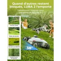 - Un choix de confiance pour les complexes et les terrains: grâce à une couverture améliorée du signal RTK et à la technologie de positionnement par vision 3D, les endroits avec des signaux faibles ou une couverture d’arbres importants ne sont plus un problème. Le tondeuse robot gazon à traction intégrale LUBA 2 AWD 3000 peut gérer des pentes allant jusqu’à 80 %/38 degrés, couper à une hauteur maximale de 7 cm et couvre jusqu’à 500 ㎡ par heure, parfait pour les pelouses jusqu’à 3000 ㎡.