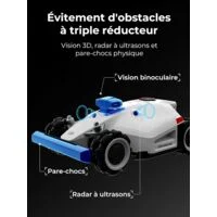 - Évitement d’obstacles à triple réduction, protégez votre sécurit: la Luba 2 AWD tondeuse robot utilise une triple combinaison technologique de reconnaissance visuelle, de radar à ultrasons et de capteurs physiques pour éviter les obstacles de manière collaborative. Les capteurs sont disposés dans une configuration géométrique, ce qui entraîne zéro angle mort dans les directions avant et latérales, offrant ainsi une triple protection de sécurité pour votre famille et vos animaux de compagnie.